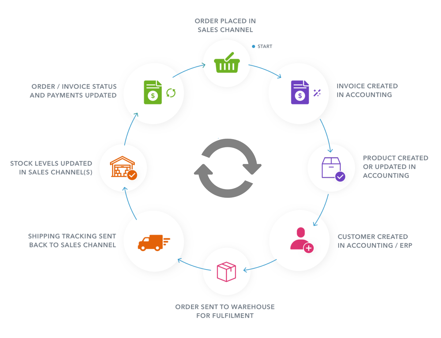 Automatically share data between popular accounting, ecommerce, fulfilment, CRM, billing & invoicing and email marketing applications.